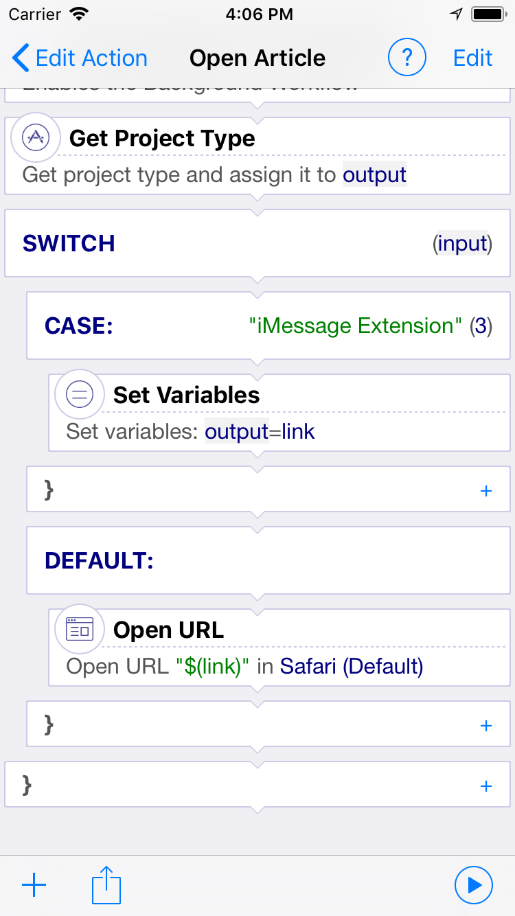 In many cases similar Workflows with minimal changes can be utilized as the Main Workflow and, for example, iMessage Workflow. To avoid having two Workflows and copy-pasting tasks between them it is (sometimes) feasible to have just one Main Workflow with some differences based on the type of the project (e.g. the App or the iMessage Extension) the Action is running in. A "Get Project Type" task allows getting the project type and handling it in the following Switch to make desired project specific behavior.