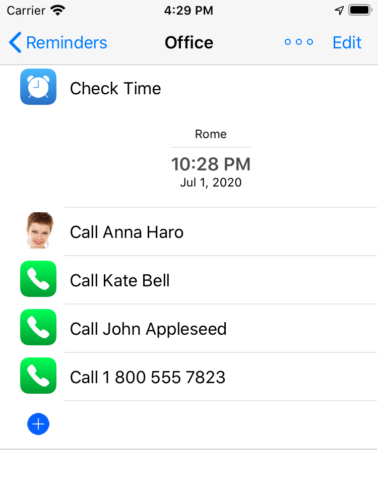 For example, if you start creation of a new Reminder and type "Call 1 800 555 7823" as its title - Alloy will offer the "Call" Action. If that action is chosen - it will pickup entered phone number, so this number will be dialed as a part of the Reminder's completion.